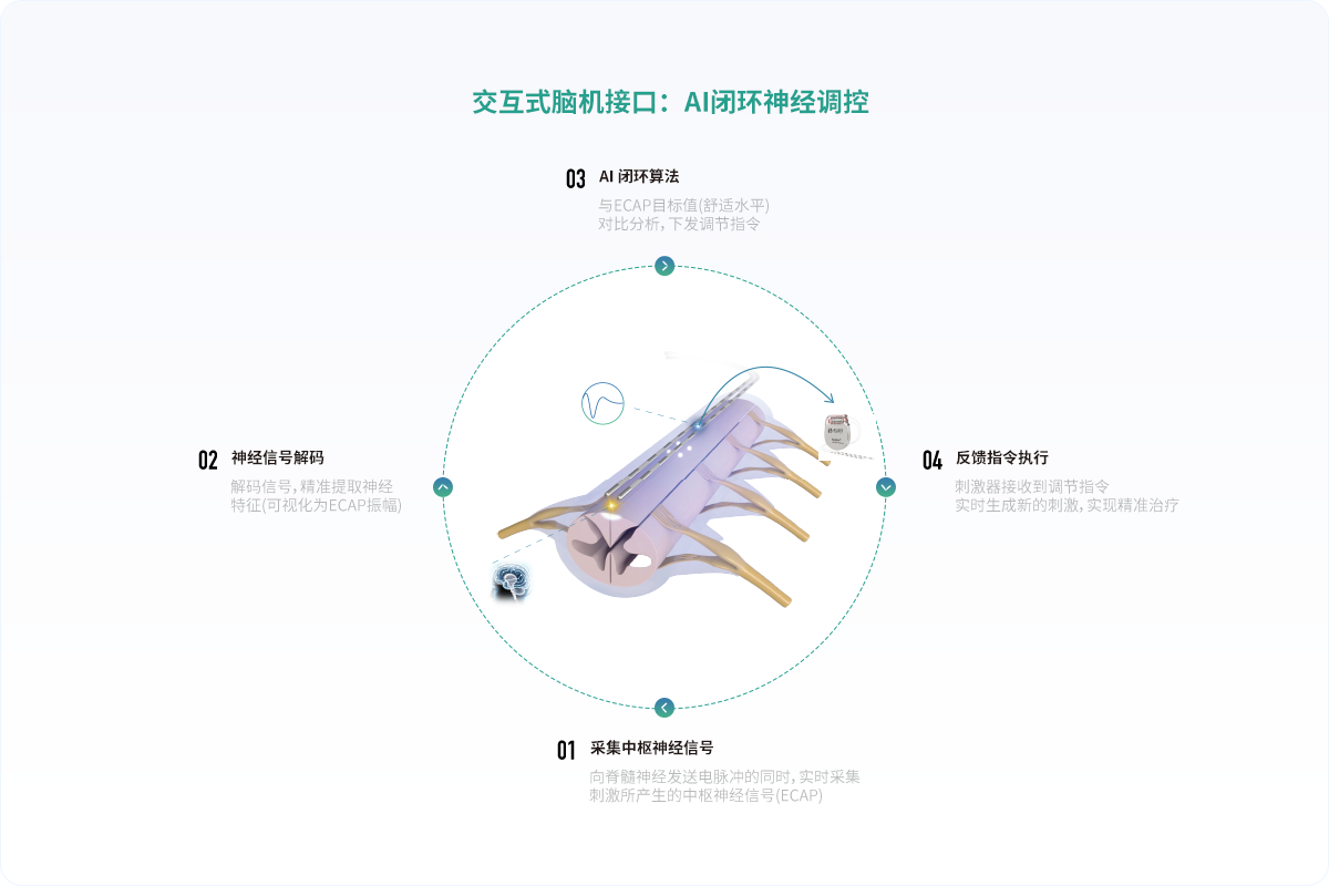 NewStim®通过实时测量和解码中枢神经信号,自动智能调整刺激参数,形成脑-机交互的闭环反馈,从而精确控制患者在不同体位和活动下的刺激需求,提高临床镇痛稳定性与可靠性。预期用于慢性疼痛治疗,脊髓损伤、颅脑损伤、脑卒中后功能恢复等。